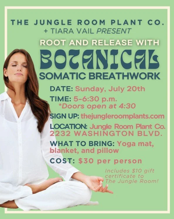 This transformative somatic breathwork session will be held in the peaceful, plant-filled atmosphere of The Jungle Room Plant Co. and taught by Tiara Vail.